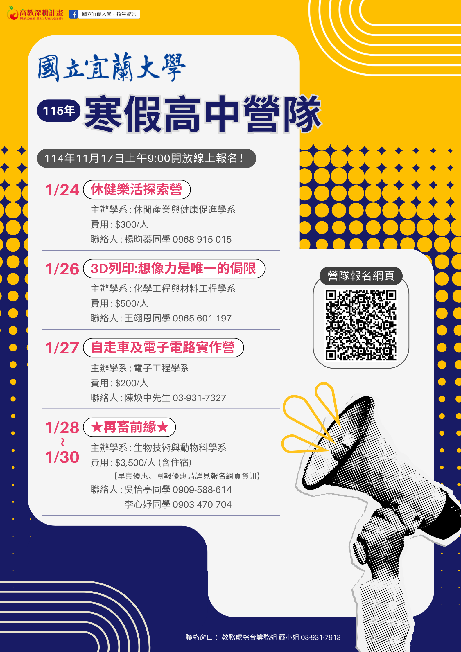 一、 檢附活動海報乙份,完整訊息請至活動網站(網址:https://sites.google.com/ems.niu.edu.tw/115winter),或由國立宜蘭大學首頁(網址:https://www.niu.edu.tw)/招生資訊/在宜大夢想起飛/高中營隊查詢。