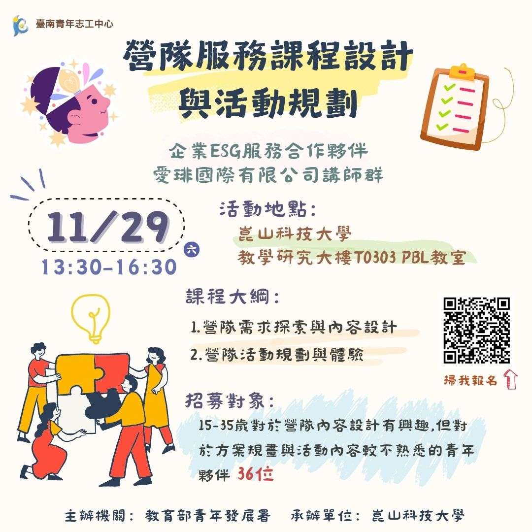 一、 培訓目的:期待透過此培訓讓青年夥伴理解營隊設計背後的核心思維,從需求探索到內容發想,再到活動規劃與帶領體驗,培養能獨立設計並執行完整營隊的能力。