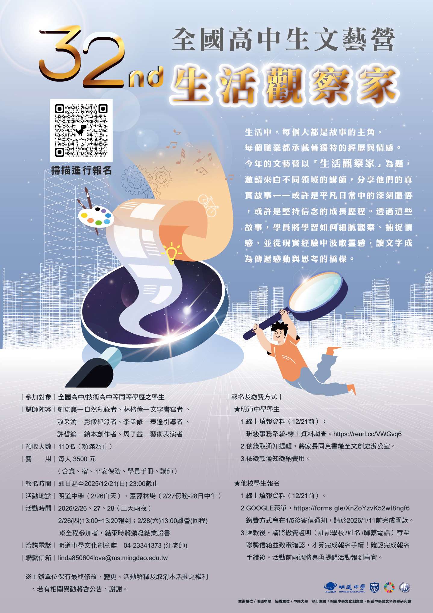 七、 報名及繳費方式:線上報名(2025/12/21前),詳細資料請見以下網址:https://reurl.cc/QVW3bo,確認完成報名手續後,活動前兩週將專函提醒報到事宜。