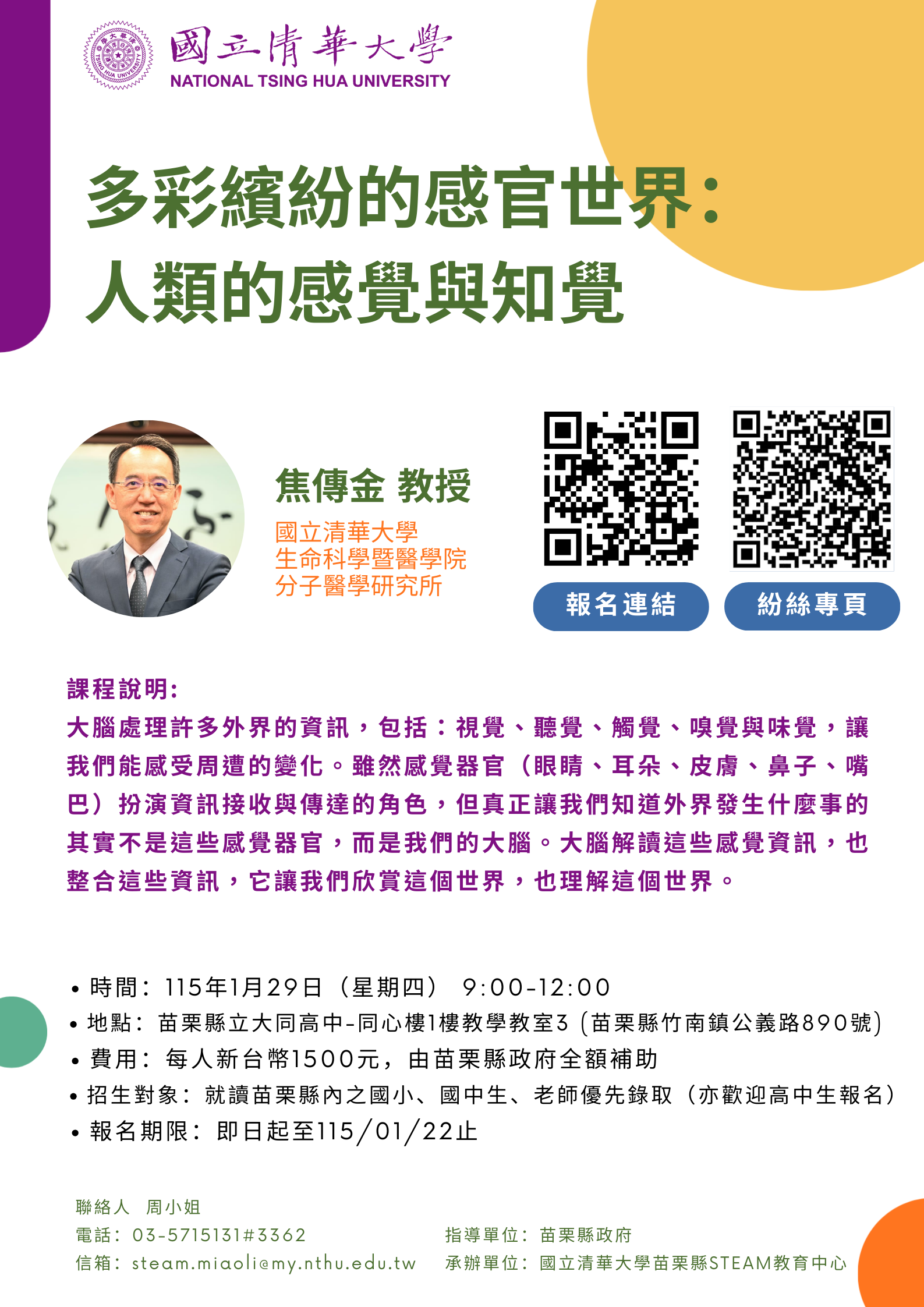 一、 本次課程以「多彩繽紛的感官世界:人類的感覺與知覺」為主題,由本校生命科學暨醫學院分子醫學研究所焦傳金教授指導。