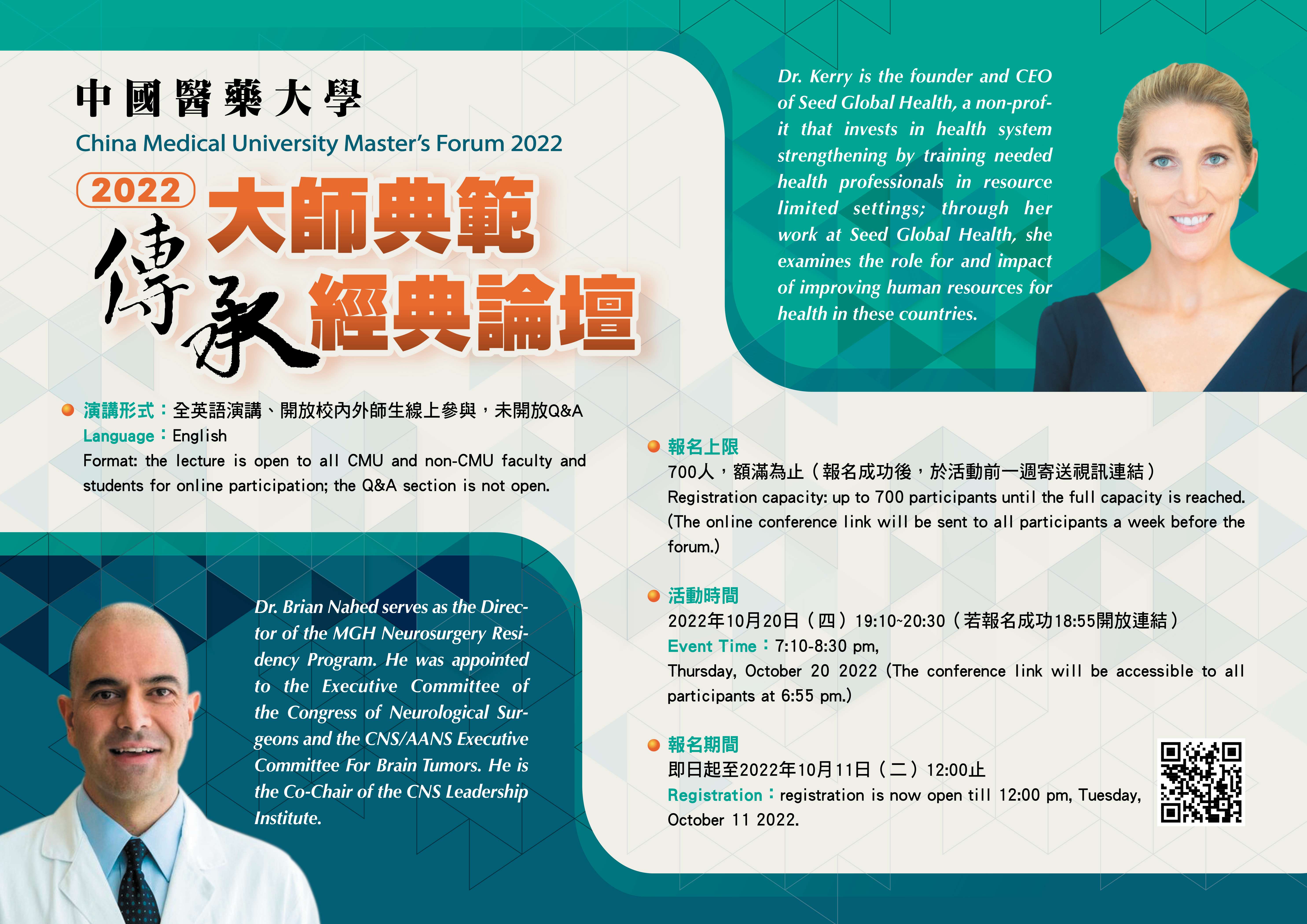 一、 | 活動主旨:2022秋季大師典範傳承經典論壇邀請到國際知名哈佛大學兩位專家學者闡述如何投入全球醫療實踐更與於NGO組織進行結合的經驗分享,其中Dr. Vanessa Kerry更是 Seed Global Health 的創始人兼首席執行,相信能讓與會師生收穫豐碩 |