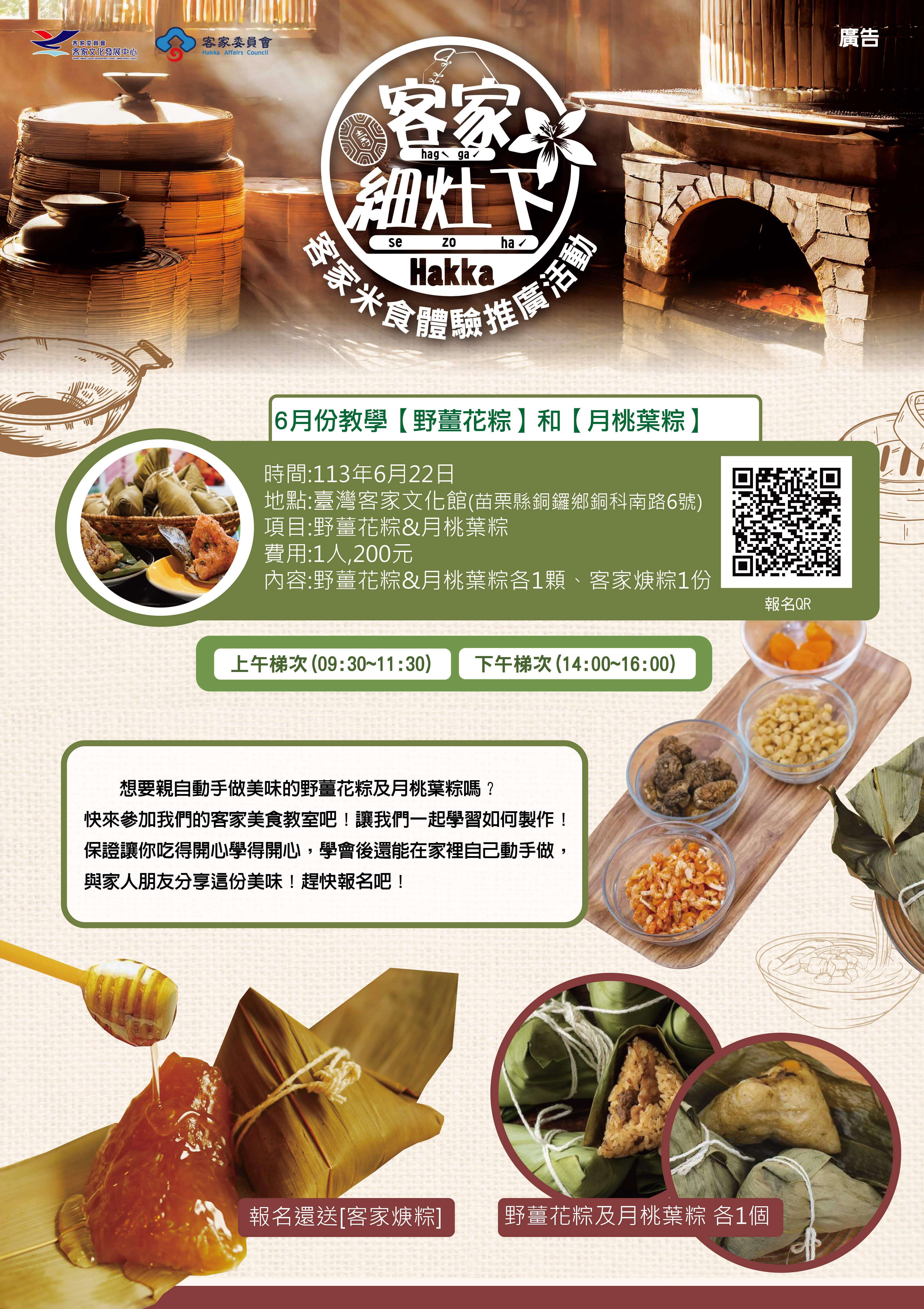 為推廣客家粄食文化,規劃於本中心(苗栗縣銅鑼鄉九湖村銅科南路6號)辦理「客家細灶下-米食體驗推廣活動」,邀請在地專業米食老師,教導粄食製作與客家粄食文化,內容豐富。檢附活動報名海報,。