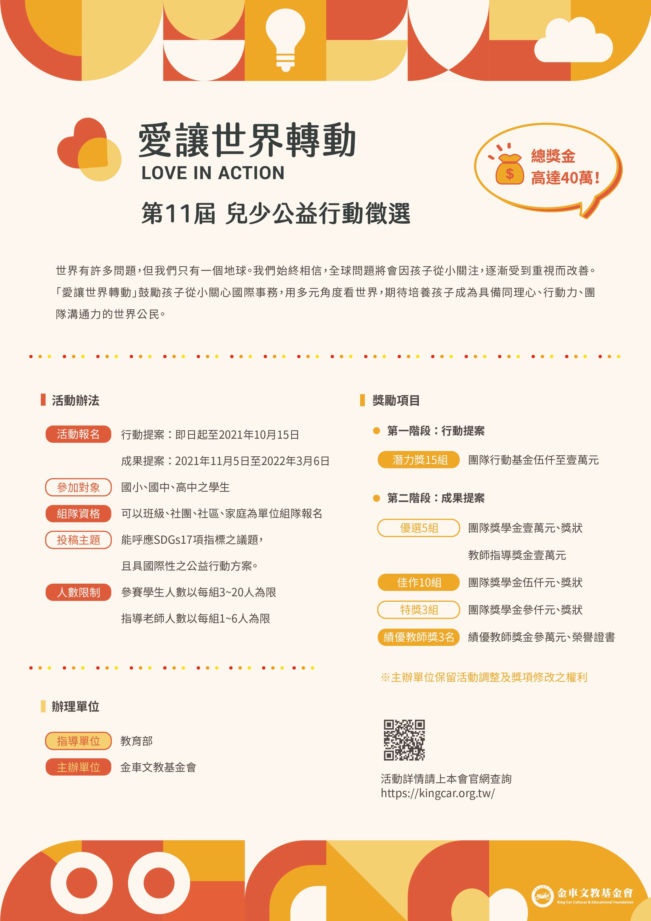 一、 | 本會自2011年開始舉辦「愛讓世界轉動 兒少公益行動」徵選,多年來累積超過萬名來自全台各地師生踴躍參與,以STAGE行動步驟讓孩子走進世界舞台,學習發現問題、付諸行動、發揮愛心並能收穫成長。 |
