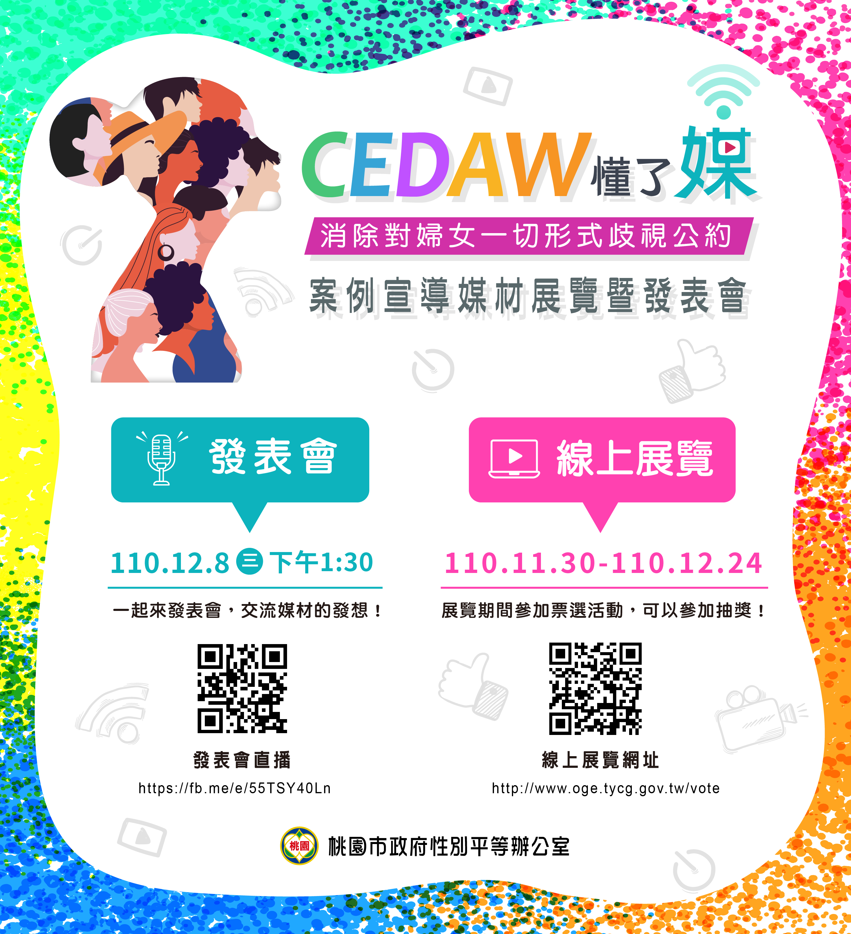 2、 | 為提高民眾參與展覽及了解CEDAW之精神與意涵,展覽期間將於桃園市政府社會局臉書粉絲專頁舉辦抽獎活動;展覽結束後將進行抽獎,並提供80名之獎品。 |