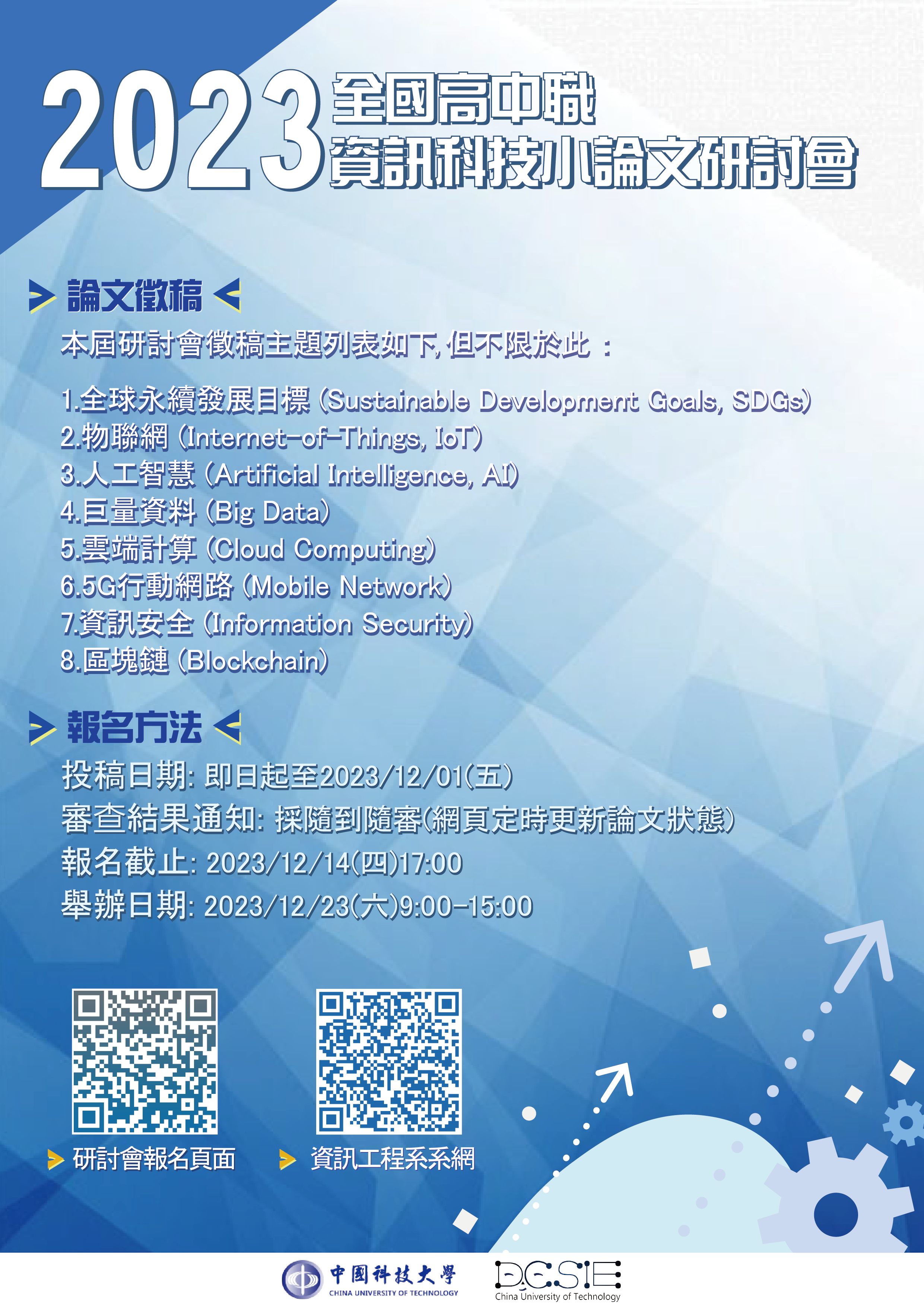 一、 | 2023全國高中職資訊科技小論文研討會訂於2023年11月25日(星期六)於中國科技大學台北校區舉行,歡迎全國高中職學生踴躍投稿。 |