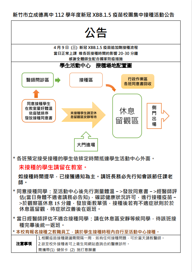新竹市立成德高中 112 學年度新冠 XBB.1.5 疫苗校園集中接種活動公告