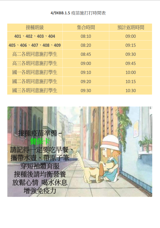 本校將於113.4.9早上08:30於活動中心辦理新冠XBB.1.5疫苗接種,請有同意施打的學生一公布時間至活動中心集合,因本次施打人數僅307人,請同意施打的教職員工盡快於活動中心接種,以免向隅。