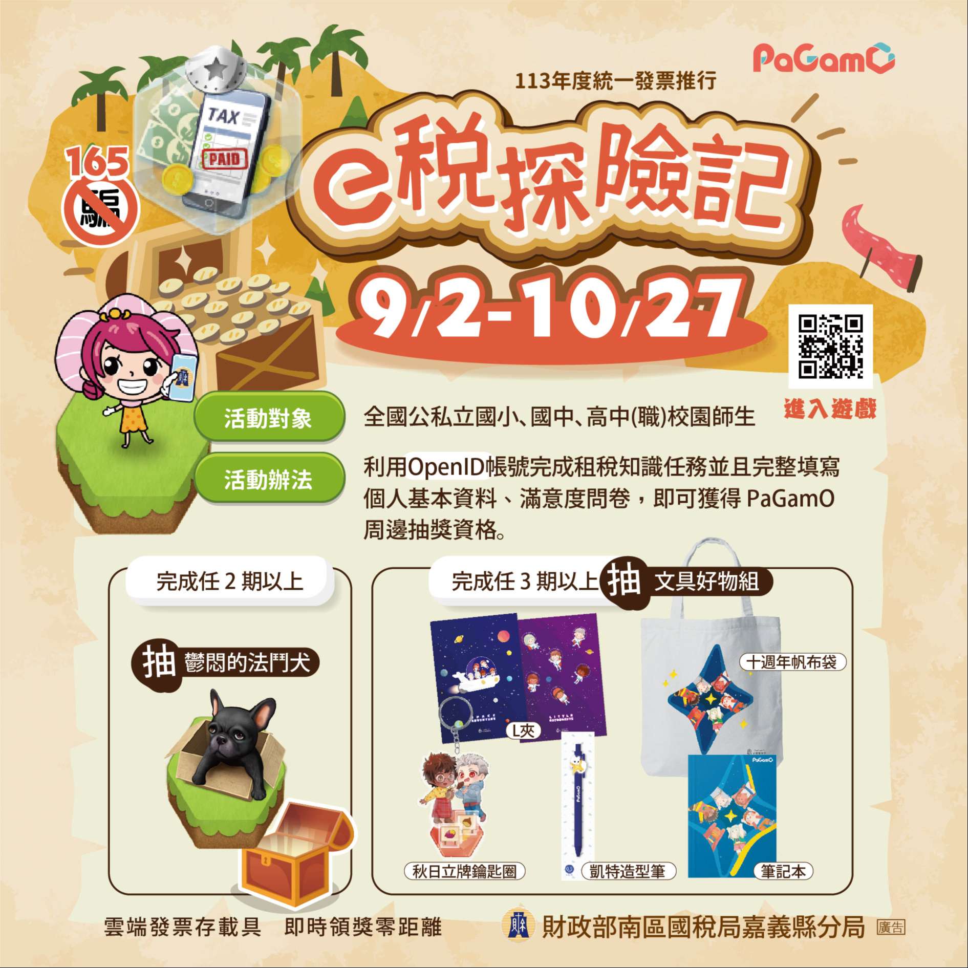 四、 | 活動辦法:校園師生在活動期間內利用Open ID登入PaGamO 線上遊戲學習平台,再至任務書點選「世界任務」,選擇 「e稅探險記」任務書,完成任一主題任務(有雲端發票、 反詐騙、性別平等、廉能政策總計4檔期任務),任務完成可獲得任務限定「虛擬寶物-E稅載具」作為任務獎勵。 |