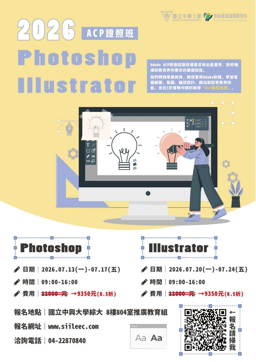 三、本校同步推出多項暑期熱門課程與證照輔導,包括「Python程式系列」、「人工智慧工程素養認證輔導」、「ACP國際證照-Photoshop與Illustrator考照班」、「SSE色彩學證照輔導」及「CCS生成式AI基礎能力認證班」等,內容結合理論與實作,適合國高中生探索興趣並強化專業能力。